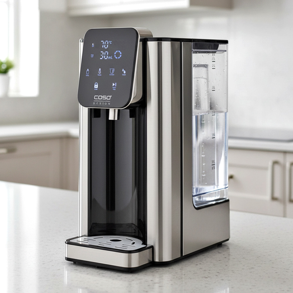 Нагрев воды диспенсера CASO регулируется в диапазоне 40-100° C (с шагом 10° C), что позволяет выбрать оптимальную температуру для каждого пользователя и напитка.